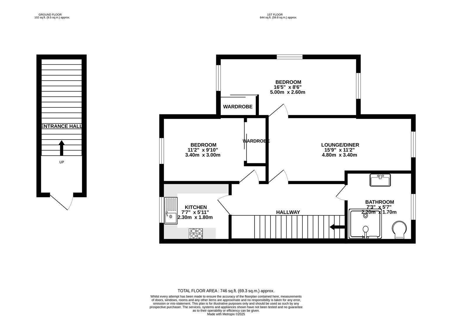 The accommodation includes a generously sized lounge/diner, a modern separate kitchen, two well-proportioned bedrooms—one with built-in wardrobes—and a family bathroom. The master bedroom offers ample space for a double bed and additional furnishings.
